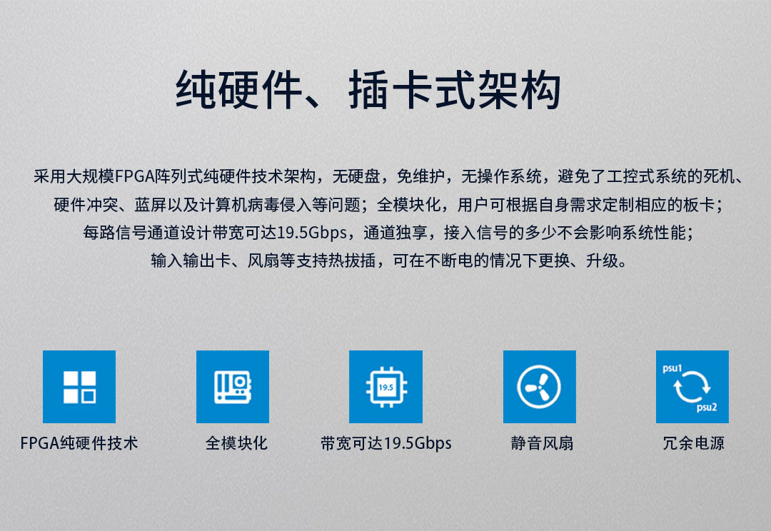 采用大規模陣列式硬件技術架構,無硬盤,免維護,無操作系統,避免了工控式系統的死機、硬件沖突、藍屏以及計算機病毒侵入等問題; 全模塊化,用戶可根據自身需求定制相應的板卡;每路信號通道設計帶寬可達19.5Gbps,通道獨享,接入信號的多少不會影響系統性能;輸入輸出卡、風扇等支持熱拔插,可在不斷電的情況下更換、升級。