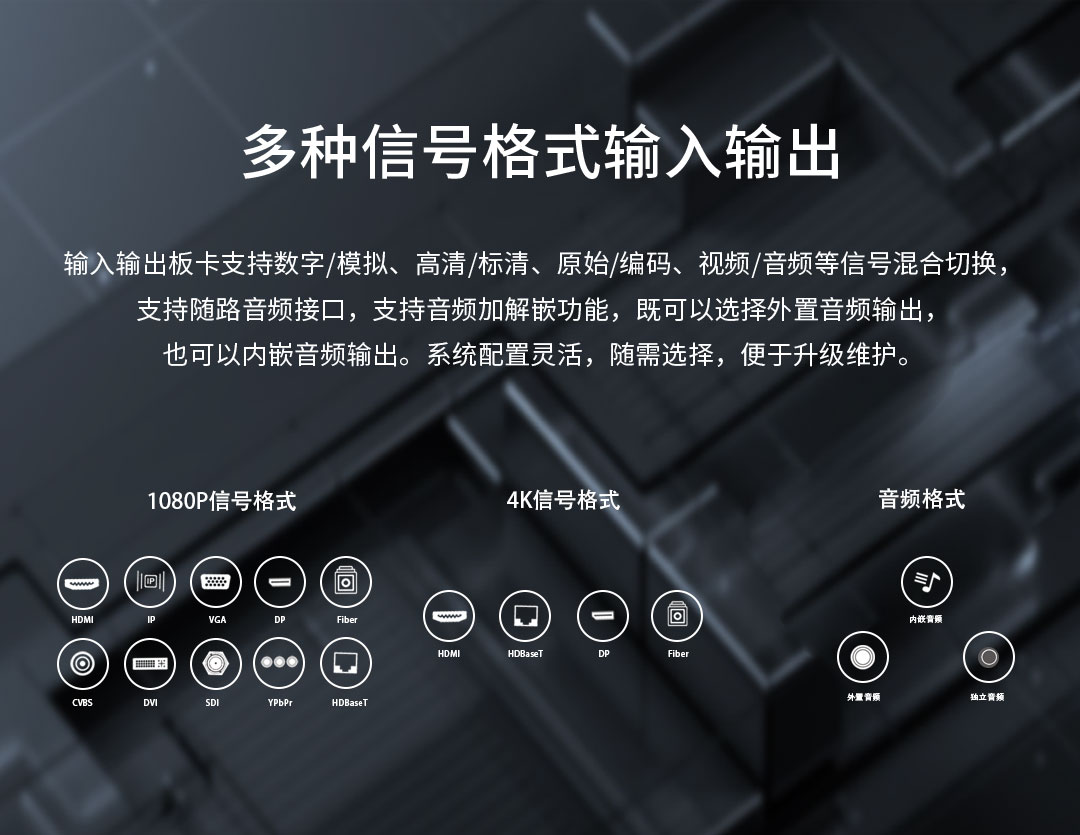 輸入輸出板卡支持數字/模擬、高清/標清、原始/編碼、視頻/音頻等信號混合切換,支持隨路音頻接口,支持音頻加解嵌功能, 既可以選擇外置音頻輸出,也可以內嵌音頻輸出。系統配置靈活,隨需選擇,便于升級維護。