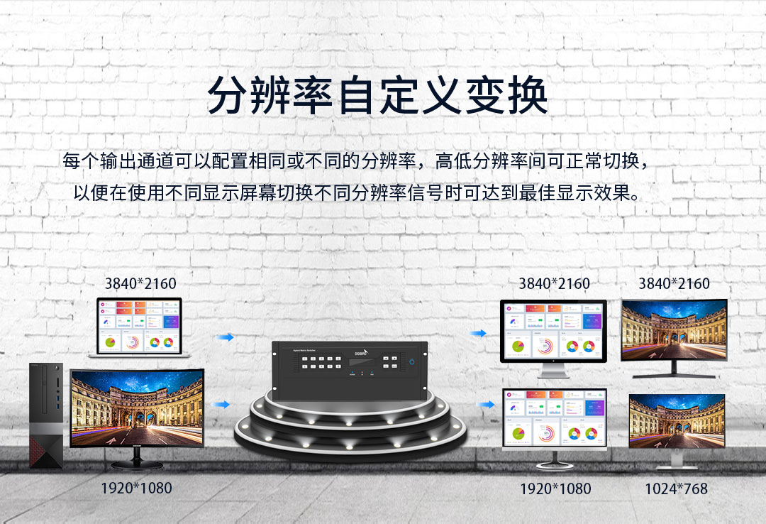 每個輸出通道可以配置相同或不同的分辨率,高低分辨率間可正常切換,以便在使用不同顯示屏幕切換不同分辨率信號時可達到更優質的顯示效果。