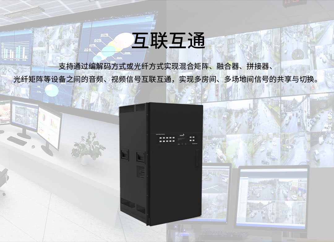 支持通過編解碼方式或光纖方式實現混合矩陣、融合器、拼接器、光纖矩陣等設備之間的音頻、視頻信號互聯互通,實現多房間、多場地間信號的共享與切換。