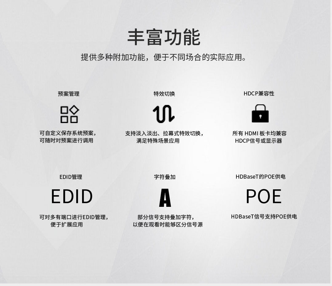 [廣泛兼容的信號類型] [高至4K的無縫切換] [靈活定義的拼矩功能] [舒適易用的交互方式]