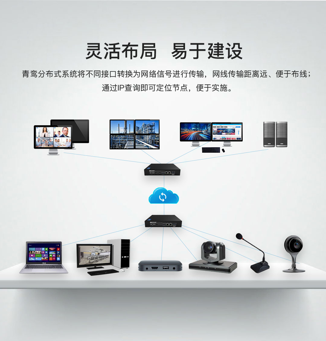 青鸞分布式系統(tǒng)將不同接口轉(zhuǎn)換為網(wǎng)絡(luò)信號(hào)進(jìn)行傳輸,網(wǎng)線傳輸距離遠(yuǎn)、便于布線;通過IP查詢即可定位節(jié)點(diǎn),便于實(shí)施。
