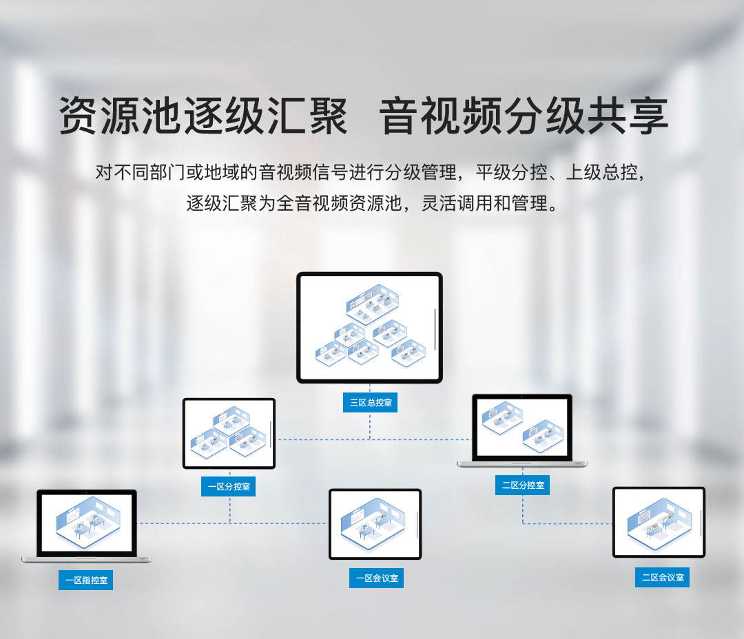 對(duì)不同部門或地域的音視頻信號(hào)進(jìn)行分級(jí)管理,平級(jí)分控、上級(jí)總控,逐級(jí)匯聚為全音視頻資源池,靈活調(diào)用和管理。