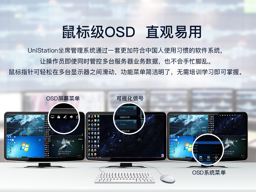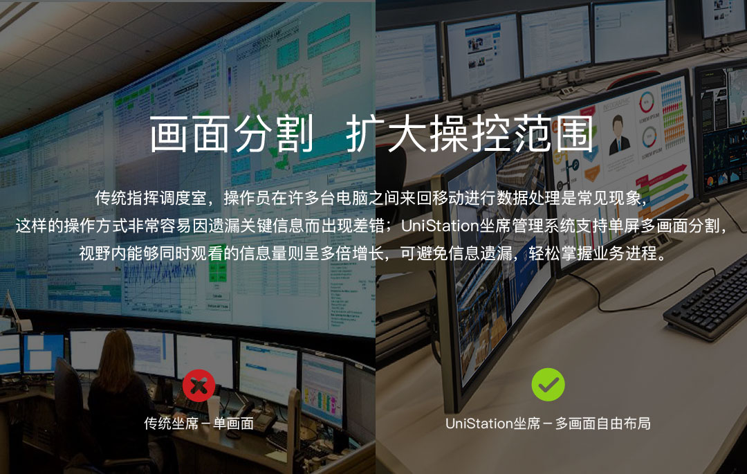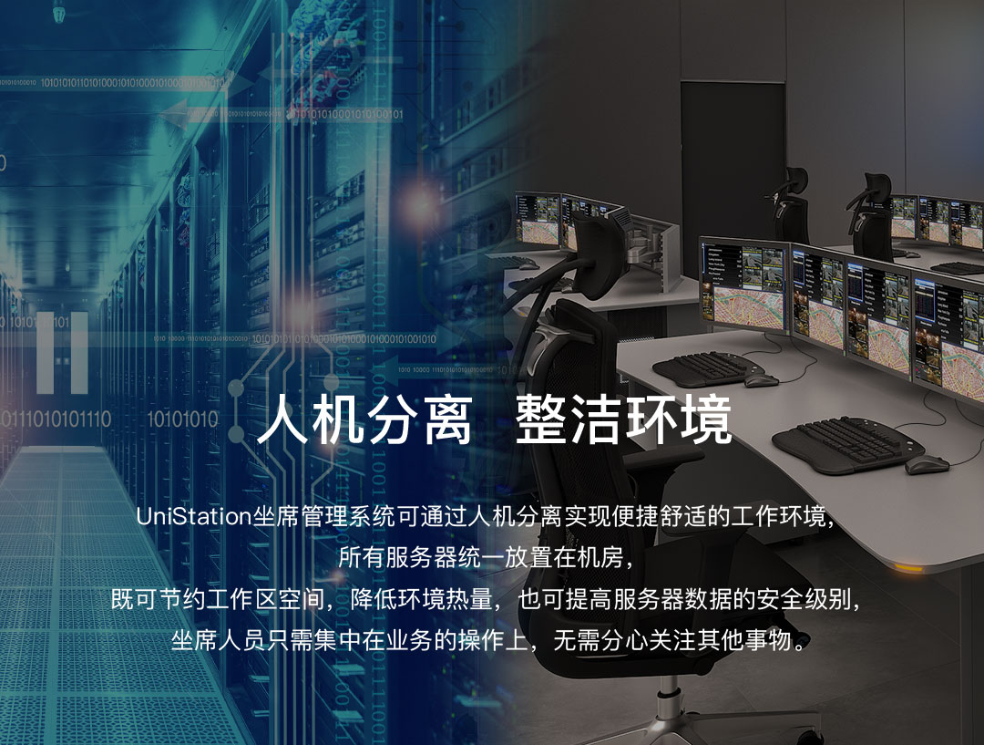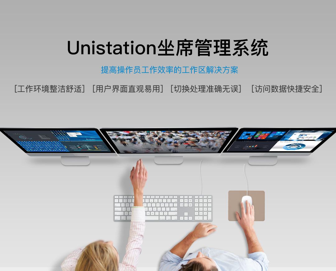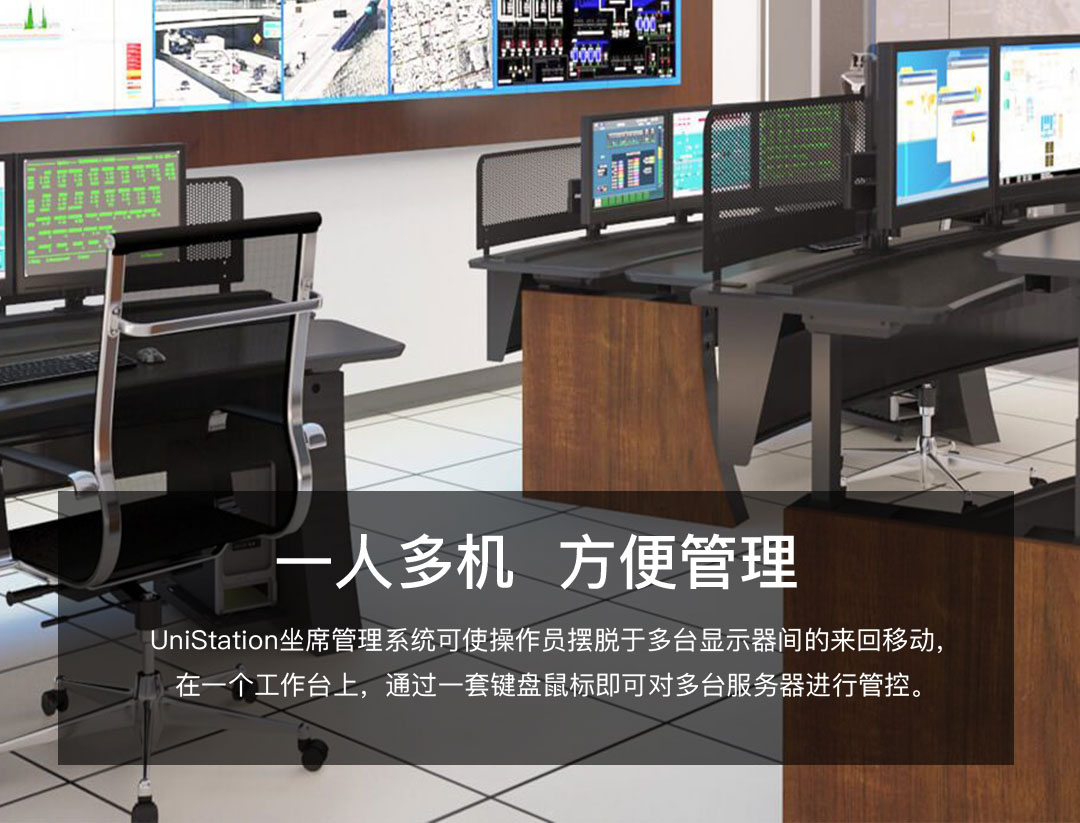 UniStation坐席管理系統可使操作員擺脫于多臺顯示器間的來回移動,在一個工作臺上,通過一套鍵盤鼠標即可對多臺服務器進行管控。