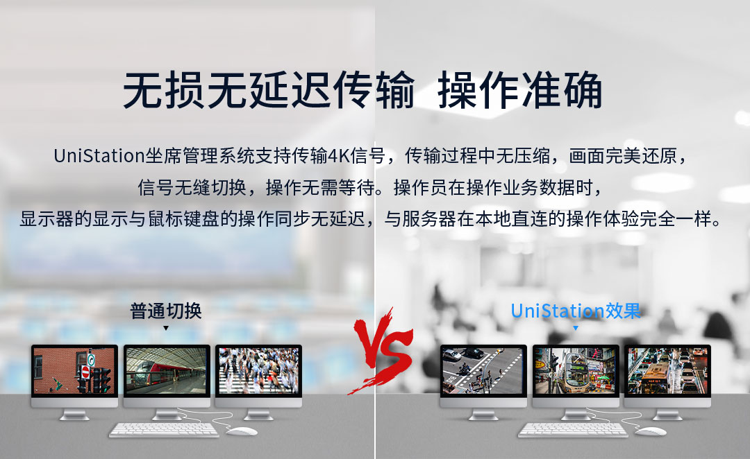UniStation坐席管理系統支持傳輸4K信號,傳輸過程中無壓縮,畫面真實還原,信號無縫切換,操作無需等待。操作員在操作業務數據時,顯示器的顯示與鼠標鍵盤的操作同步,與服務器在本地直連的操作體驗一致。