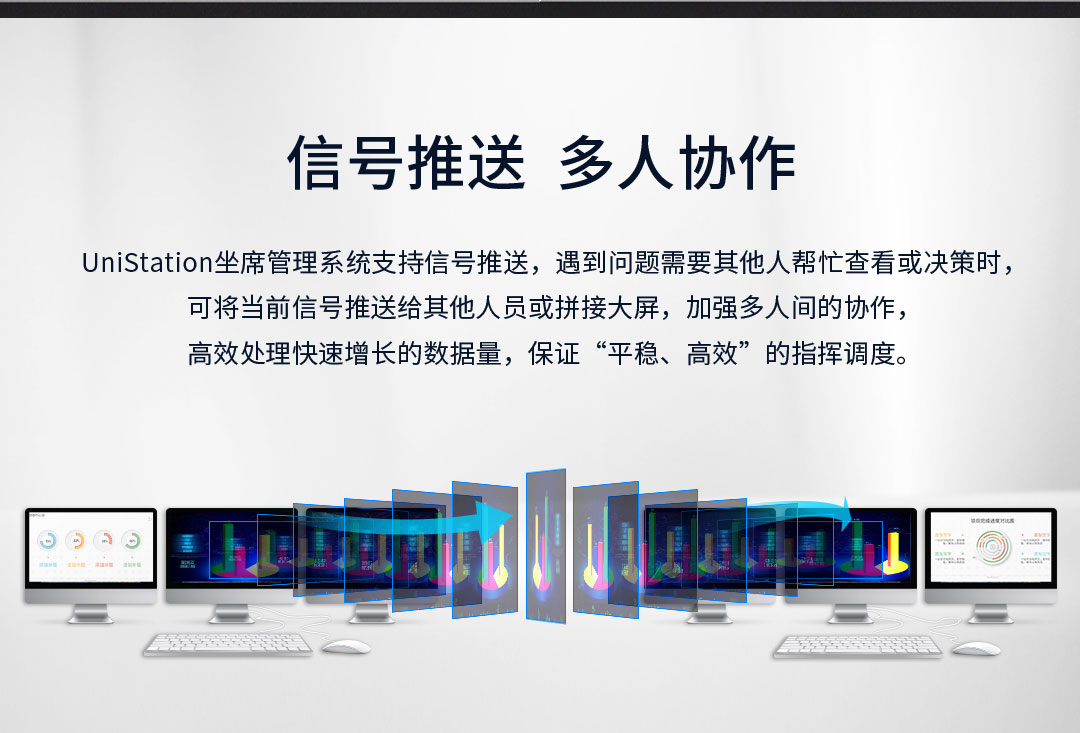 UniStation坐席管理系統支持信號推送,遇到問題需要其他人幫忙查看或決策時,可將當前信號推送給其他人員或拼接大屏,加強多人間的協作,高效處理快速增長的數據量,保證“平穩、高效”的指揮調度。
