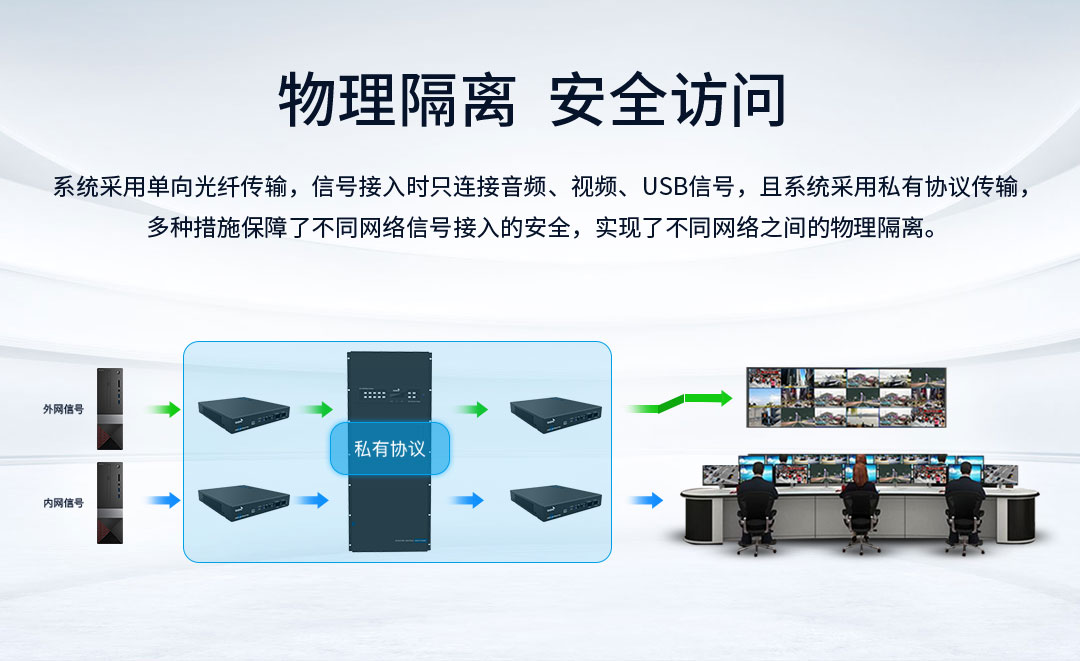 系統采用單向光纖傳輸,信號接入時只連接音頻、視頻、USB信號,且系統采用私有協議傳輸,多種措施保障了不同網絡信號接入的安全,實現了不同網絡之間的物理隔離。