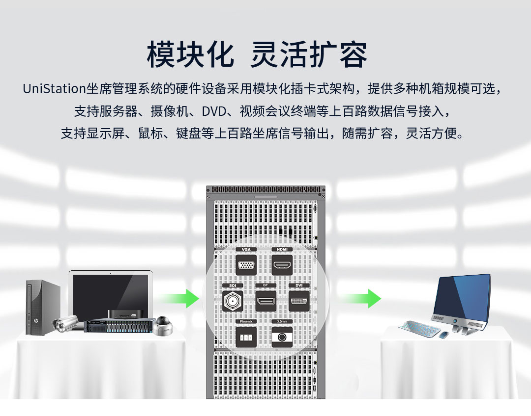 UniStation坐席管理系統的硬件設備采用模塊化插卡式架構,提供多種機箱規模可選,支持服務器、攝像機、DVD、視頻會議終端等上百路數據信號接入,支持顯示屏、鼠標、鍵盤等上百路坐席信號輸出,隨需擴容,靈活方便。