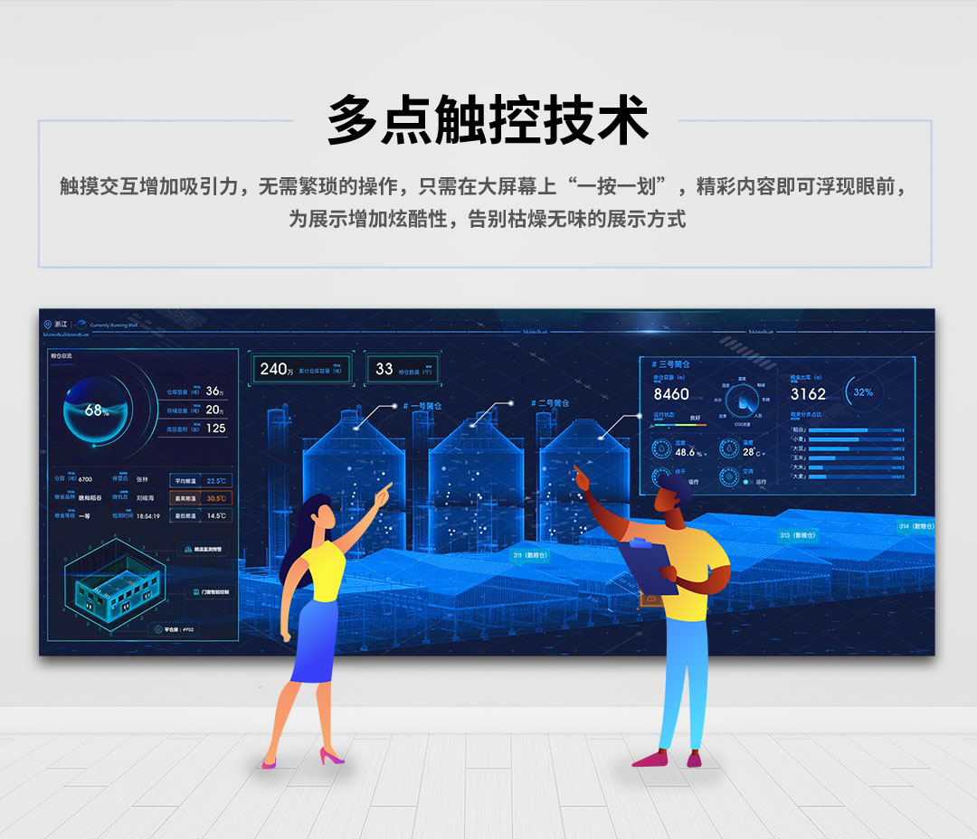 觸摸交互增加吸引力,無需繁瑣的操作,只需在大屏幕上“一按一劃”,精彩內容即可浮現眼前, 為展示增加炫酷性,告別枯燥無味的展示方式