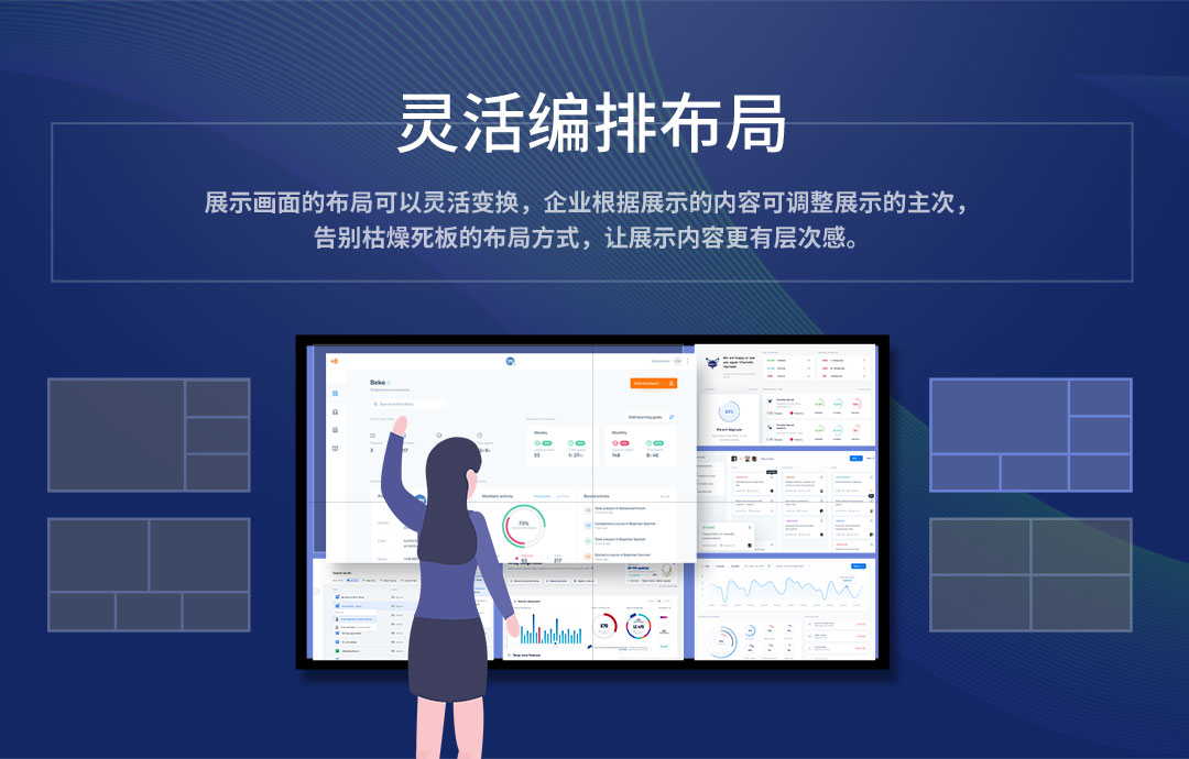 展示畫面的布局可以靈活變換,企業根據展示的內容可調整展示的主次, 告別枯燥死板的布局方式,讓展示內容更有層次感。