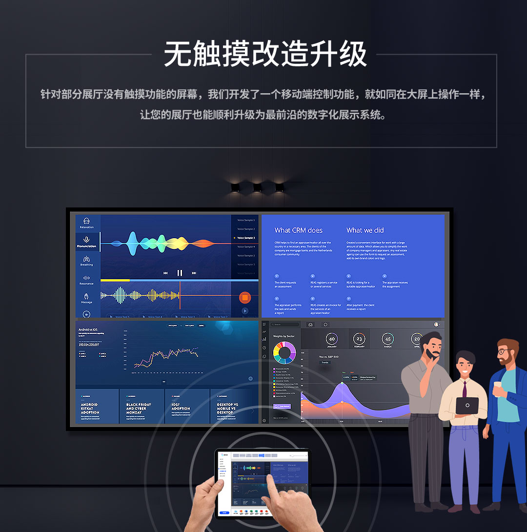 針對部分展廳沒有觸摸功能的屏幕,我們開發了一個移動端控制功能,就如同在大屏上操作一樣, 讓您的展廳也能順利升級為先進的數字化展示系統。