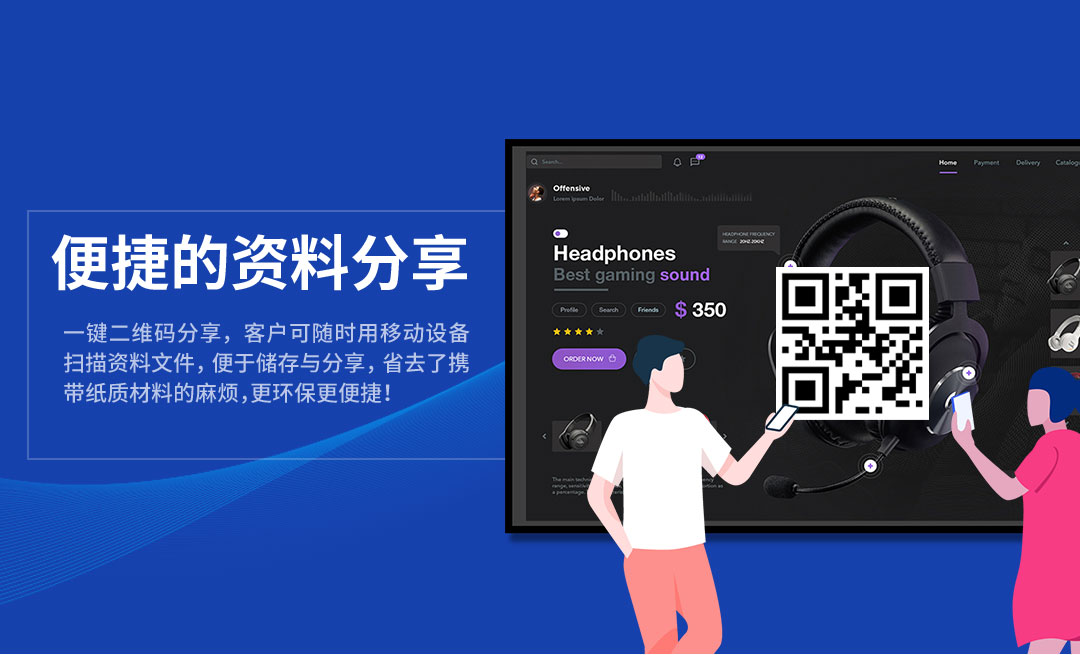 一鍵二維碼分享,客戶可隨時用移動設備掃描資料文件,便于儲存與分享,省去了攜帶紙質材料的麻煩,更環保更便捷!